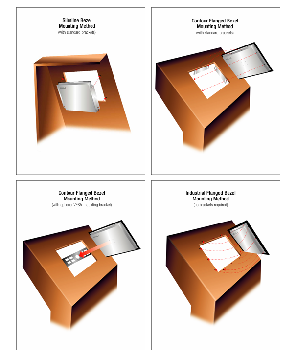 Multiple Mounting and Bezel Options Multiple mounting and bezel options enable customers to meet their application needs at minimal cost. The C1001PW display offers a 75mm VESA pattern to provide arm mounting capability for industrial automation equipment. This minimizes the capital expenditure needed to upgrade equipment with touch. L-brackets are included for installations requiring the touch display to be fully enclosed.